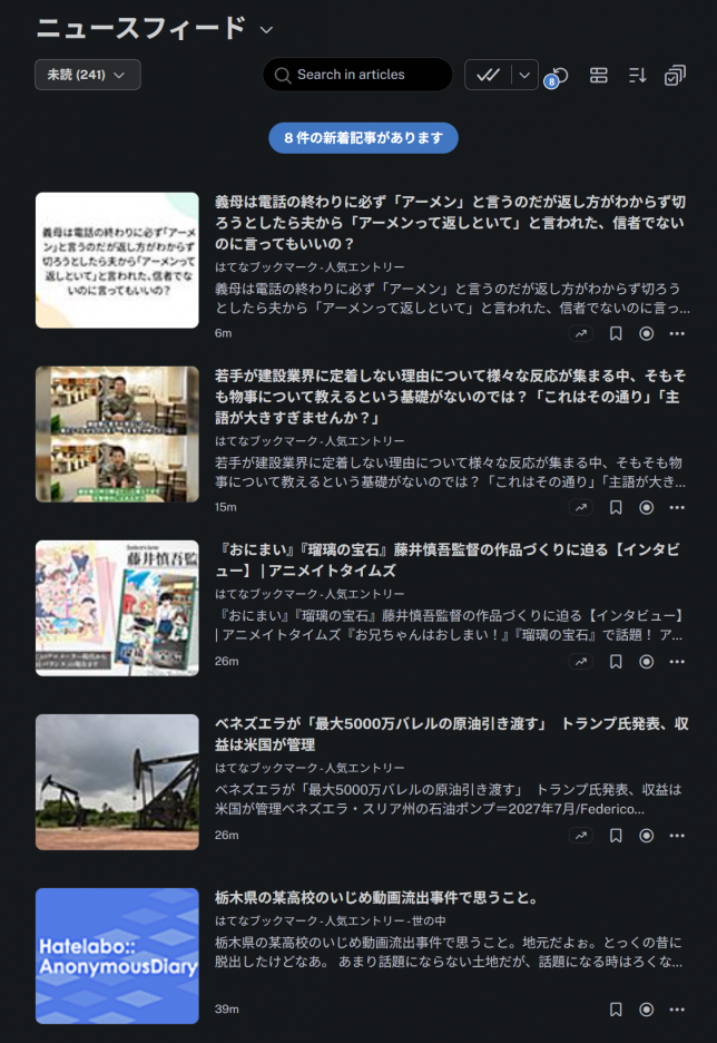 というわけでXというプラットフォームから逃がさないために即応的な情報ばかりが流れる環境を作り上げたX社、まんまとそこで落ち着いている自らの現状に漠然とした危機感を覚えたわたくしは、ChatGPTの「いいと思うよ」という後押しを背にRSSリーダーを導入し、トレンドの記事がいっぱい流れてくる環境を手に入れました。便利だねこれ。