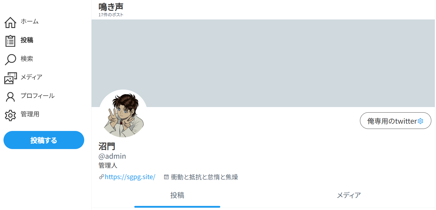 そこでふと「サーバー移転してCGI使えるようになったやった~」と思って試しにアップして動作確認したものの「今は使わないかな」と思ったばかりの「てがろぐ」がX禁煙パイポとしてかなり良いのでは?と思い、配布されているX風スキンを実装して俺専用Twitter「鳴き声」として運用してみることにしました。